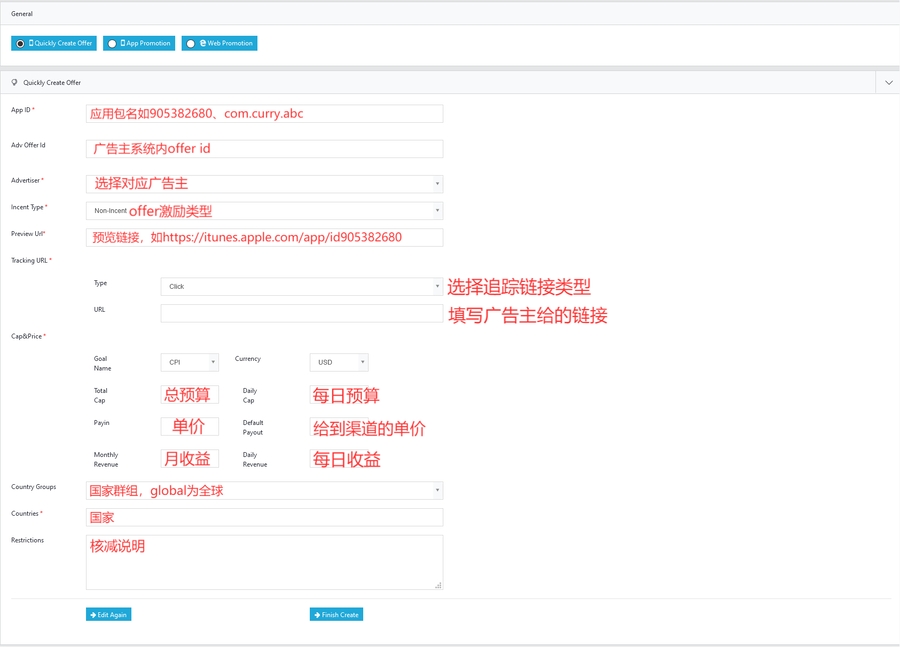 Quickly Create Offer:快速创建offer,适用app offer,只需填写较少信息,需填写应用包名,可较快创建offer。 App Promotion:app推广,适用app offer,需填写详细信息,需填写应用包名。 Web Promotion:页面推广,适用页面推广,无需填写应用包名。